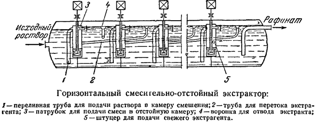 Горизонтальный экстрактор такого типа представляет собой цилиндрический аппарат, разделённый перегородками на отсеки. Каждый отсек состоит из камеры смешения (труба с внутренним погруженным насосом) и отстойной камеры. Исходный раствор, подаваемый в экстрактор, поступает по переливной трубе 1, в первую по ходу раствора камеру смешения. В эту же камеру по трубе 2 поступает из предыдущей ступени экстрагент, обогащённый извлекаемым веществом. В камере смешения фазы при помощи насоса перемешиваются, и смесь подаётся через патрубок 3 на разделение в отстойную камеру. Отсюда экстракт отводится из аппарата через воронку 4, а обеднённый раствор (рафинат) по переливной трубе направляется в следующую камеру смешения, где снова смешивается с экстрактом, поступающим из предыдущей ступени, а затем смесь направляется в следующую отстойную камеру. Смешение и разделение фаз повторяется многократно, вплоть до последней ступени, где раствор смешивается со свежим экстрагентом, поступающим через штуцер 5. Из этой ступени удаляется конечный рафинат.