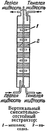 В вертикальных экстракторах прямоугольные отстойные камеры установлены непосредственно одна над другой, для смешения фаз служат насосы, смонтированные на боковых стенках отстойных камер. Колонна разделяется по высоте на чередующиеся смесительные и отстойные секции, причём отстойные секции (каждая высотой 0,3 м и более) заполнены специальной насадкой. В смесительных зонах перемешивание производится четырёхлопастными мешалками, вращающимися на общем вертикальном валу, который проходит по оси колонны. Такие аппараты занимают значительно меньшую площадь, чем горизонтальные смесительно-отстойные экстракторы. Кроме того, благодаря прямоугольной форме отстойных камер удаётся уменьшить отношение высоты камер к их сечению, что способствует ускорению отстаивания и приводит к большей компактности аппарата.