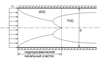 Рассмотрим начальный участок входа потока в трубу круглого сечения (см. рисунок). На внутренней поверхности трубы образуется динамический пограничный слой, который может быть как ламинарным, так и турбулентным. На рисунке приведена картина формирования турбулентного ПС. На некотором расстоянии от входа в трубу пограничные слои смыкаются, и в поперечном сечении трубы устанавливается стабильное распределение скоростей.