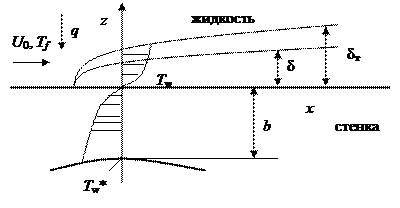 Температура в тепловом пограничном слое изменяется от значения ее в тепловом потоке Tf до Tw на стенке. По толщине стенки температура изменяется от Tw до Tw* на ее обратной стороне.