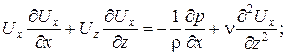 Здесь: (2) – уравнение движения в ЛПС, (3) – уравнение сплошности потока, (4) – уравнение энергии. В этих уравнениях: Ux (x,z)и Uz (x,z) – продольная и поперечная компоненты скорости в пограничном слое; T (x,z) – распределение температур в пограничном слое.