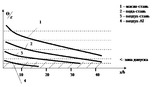 Положив толщину стенки b = 0,01 м, произведем его оценки для различных контактирующих пар (см. таблицу). Единственной переменной в указанном выражении является продольная координата x (или калибр – x/b). Задаваясь координатой, строим график зависимости комплекса Q/e от x/b (см. рис.).