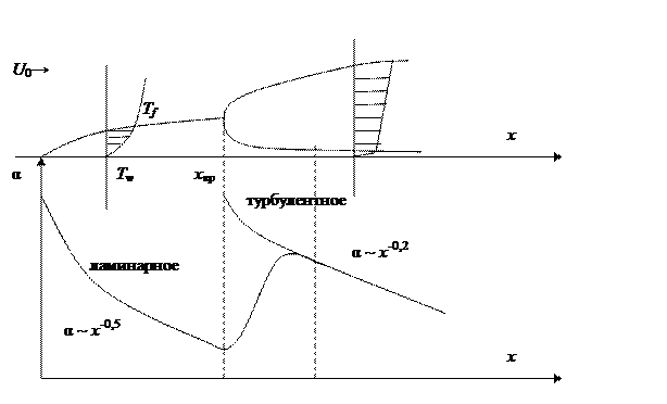 На начальном участке взаимодействия потока с пластиной развивается ламинарный пограничный слой (см. п. 1.6). При достижении продольной координатой x величины x кр, происходит постепенный переход от ламинарного режима течения в ПС к турбулентному. В начальной стадии развития ПС, когда его характер ламинарен, большую роль играют процессы теплопроводности через пограничный слой, величина которого быстро нарастает. Для зоны ЛПС характерна зависимость a~ x -0,5. Увеличение его толщины приводит к потере устойчивости ПС, и на расстоянии x кр от места присоединения потока к пластине, структура ПС становится турбулентной. При этом у поверхности стенки образуется вязкий подслой, который значительно тоньше ламинарного ПС. В турбулентной части слоя решающую роль играют процессы конвективного теплопереноса. Следовательно, с образованием турбулентного пограничного слоя происходит увеличение интенсивности теплообмена со стенкой и здесь a~ x -0,2. В переходной зоне интенсивность теплообмена увеличивается.
