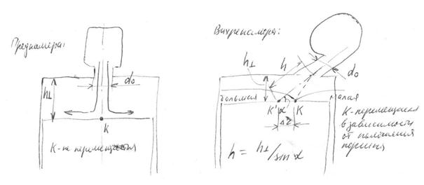 Газ, вытекая из сопла, образует пристеночную струю. Для предкамеры, истечение из которой происходит перпендикулярно поршню, передняя критическая точка не изменяет своего положения. При наклонном положении канала (вихрекамера) текущее расстояние от головки до поршня можно подсчитать по зависимости: