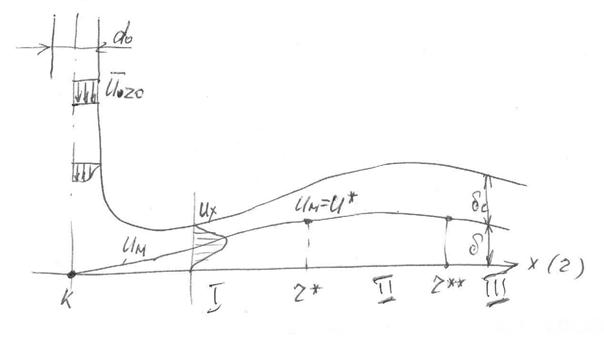 Рассмотрим структуру пристеночной струи. Весь занимаемый ею объем можно разделить на две зоны: струйную с толщиной dс и пристенную, толщина которой d. В пристенном пограничном слое образуется три зоны течения: область ускоренного течения, где скорость струйного потока увеличивается; переходная область, где скорость вблизи стенки приблизительно постоянна; и область автомодельного (замедленного) течения. В общем случае, для наклонной осесимметричной струи, максимальная скорость на границе пограничного слоя составит: