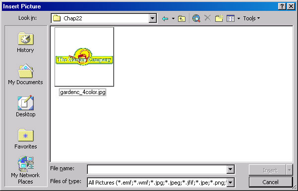 - Выделите gardenc_4color.jpg и щелкните на строке Вставить (Insert). Файл с логотипом компании может оказаться крупнее, чем нужно. В этом случае щелкните на логотипе правой кнопкой мыши, щелкните на Формат рисунка (Format Picture) и затем щелкните на вкладке Размер (Size). Уменьшите размер до 35%. Если вы использовали направленную вниз стрелку, логотип автоматически примет нужный размер. Если вы вводили 35%, нажмите клавишу (Tab), чтобы размер рисунка стал соответствовать отведенному месту.