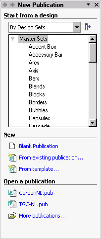 . Если область задач (New Publication) не открыта, выберите Область задач (Task Pane) в меню Вид (view). - В области задач Новая публикация (New Publication) щелкните на направленной вниз стрелке в окошке Начать с образца (Start from a design), чтобы увидеть возможные варианты.