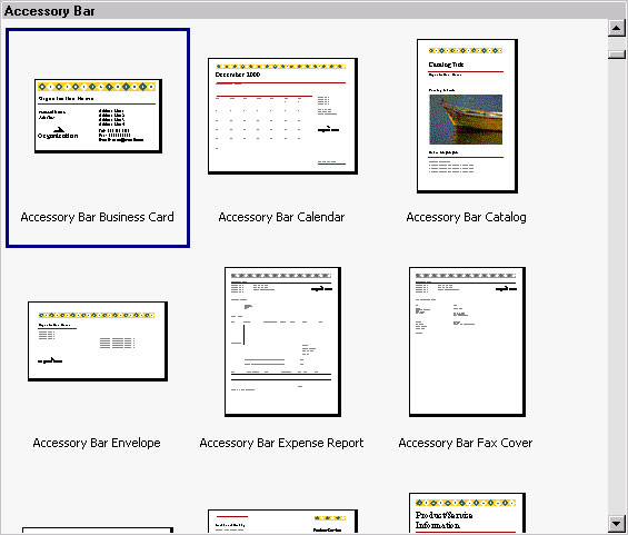 Совет.Не изменяйте без необходимости выбранный формат, и не меняйте его для разных типов документов, тогда вся ваша документация - от писем и отчетов до визитных карточек - будет оформлена в едином стиле. Все образцы, использующие формат Accessory Bar, доступны для предварительного просмотра.
