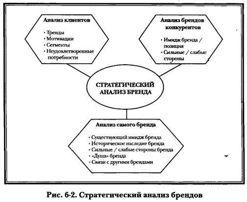 Бренд-стратегию необходимо рассматривать в трех направлениях, включающих анализ потребителя, анализ конкурентов и непосредственно анализ самого бренда (рис. 6-2) [3]. Ее конечной целью является