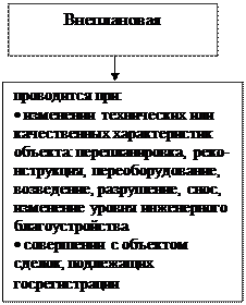 Внеплановая техническая инвентаризация объектов учета проводится при измен-ении технических или качественных характеристик объектов учета (перепланировка, реконструкция, переоборудование, возведение, разрушение, изменение уровня инженер-ного благоустройства, снос), а также при совершении с объектом учета сделок, подлеж-ащих в соответствии с законодательством РК государственной регистрации.