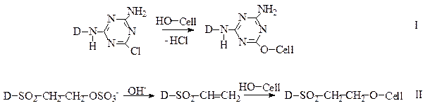 Активные красители, имеющие широкую цветовую гамму (от желтого до черного цвета) широко используются для крашения целлюлозного волокна с получением прочных окрасок за счет образования ковалентной связи по механизму нуклеофильного замещения (I) или нуклеофильного присоединения (II):