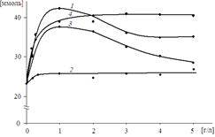 Рис. 2. Зависимость сорбции активного ВС красителя (Reactive red 35) целлюлозным волокном [ммоль] от концентрации ЧАС [г/л]: