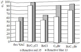 Рис. 3. Влияние ЧАС на степень выбирания α [%] активных красителей из ванны