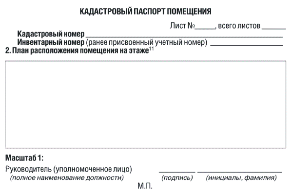 Оформляется кадастровый план помещения с учетом тех же требований, что и для кадастрового паспорта здания, сооружения, объекта незавершенного строительства. Фор-ма кадастрового плана помещения приведена ниже.
