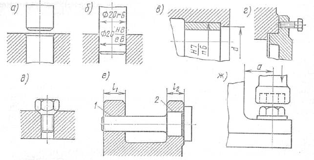 На рис. 4.1 представлены примеры конструктивного оформления некоторых соединений. Фаски облегчают процесс сборки деталей (рис. 4.1, а); направляющий поясок с подвижной (Н 8/е8) посадкой облегчает запрессовку вала (рис. 4.1, б); наличие в детали отверстия d для выколотки облегчает выпрессовку детали (рис. 4.1, в); резьбовые отверстия для отжимных винтов позволяют исключить применение специального съемника для разборки соединения (рис. 4.1, г); коническая опорная поверхность у гаек и винтов обеспечивает стопорение резьбового соединения (рис. 4.1, д) при сборке соединений по двум поверхностям 1 и 2 (рис. 4.1, е) их делают разных размеров, что позволяет избежать образования на поверхности 2 задиров (кроме того, размер l 1, делают больше l 2, что обеспечивает лучшее направление пальца при сборке); достаточное расстояние а от оси резьбового отверстия до стенки корпуса позволяет использовать более производительный торцовый ключ (рис. 4.1, ж).