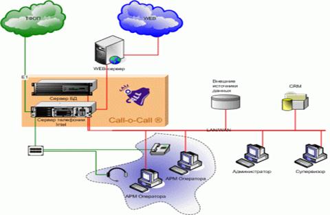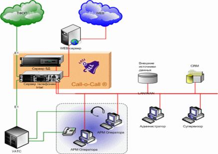 Комплекс подключается к городской АТС (или к УАТС) с помощью потоков E1. Операторы Call-o-Call MX подключаются напрямую в сервер компьютерной телефонии через специальную коммутационную панель. Тип агентских аппаратов — аналоговые (FXS). Все управление телефонными вызовами как входящими, так и исходящими, происходит в программе АРМ Оператора на компьютере оператора.