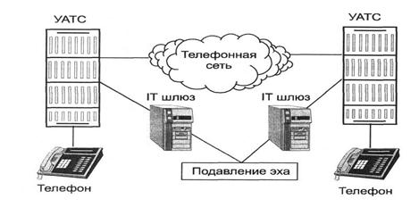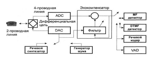 Эхо возникает в телефонной линии на гибридном переходе от 4-проводного соединения к 2-проводному. Телефонный сигнал с 2-проводной линии поступает на дифференциальную систему, которая разделяет приемную и передающую части канала. Далее сигнал передачи вместе с "просочившейся" частью сигнала приема подается на АЦП и превращается либо в стандартный 12-разрядный, либо в 8-разрядный сигнал, закодированный по ц- или А-закону. В последнем случае обработка должна также включать соответствующий экспандер.