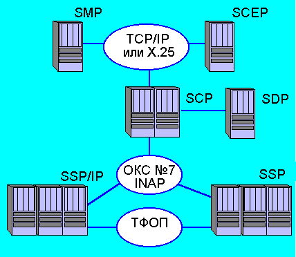 Подготовка новых услуг происходит в узле SCEP, а за введение новых услуг отвечает узел SMP. Эти два центра действуют в условиях относительного масштаба времени, и для передачи информации о новых услугах в узел SCP используется, например, протокол Х.25 или Frame Relay.
