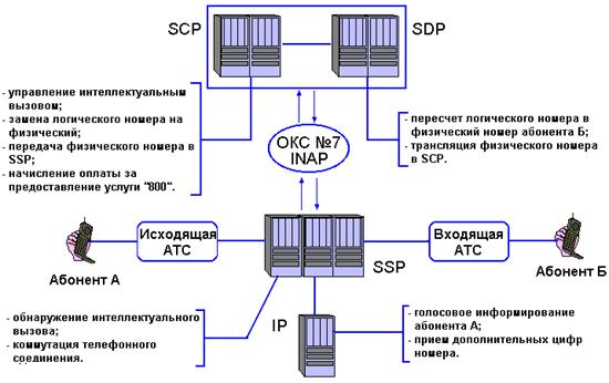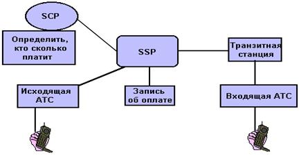 Рисунок иллюстрирует примерную схему предоставления услуги "Приплата": Абонент А набирает номер 8-ххх-809-1234, тем самым по коду "8" он выходит на междугородную сеть, а по коду "ххх" выходит на ту АМТС, которая выполняет функции SSP, "809" означает код услуги, a 1234 номер услуги. Узел БД услуг пересчитывает логический номер услуги в конкретный номер вызываемого абонента Б, а также передает в узел SCP информацию о долях оплаты за вызов между абонентами. SCP сообщает в SSP - кто, сколько должен платить за предоставление услуги (т.е. как формировать запись об услуге) и сообщает номер абонента Б (в нашем случае - дежурного юриста), который окажет требуемую услугу.