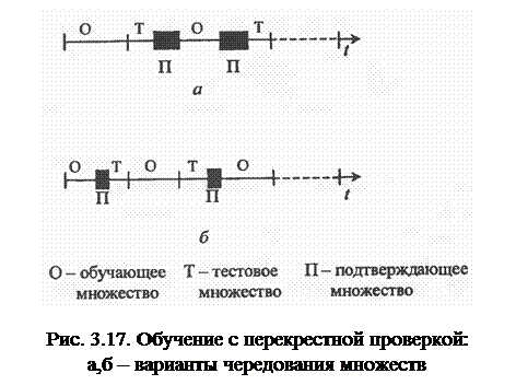Если тестовое множество используется на каждой итерации при обучении НС для определения «ранней остановки», то такой процесс называется обучением с перекрестной проверкой. На рис. 3.17 представлены стратегии обучения с перекрестной (или кросс-) проверкой. Переключение между типами множеств (обучающим, тестовым, подтверждающим) во время процедуры обучения может осуществляться вероятностным способом. Такой подход позволяет остановить обучение, когда частота появления ошибок обобщения начнет расти.