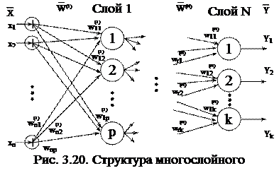 Самой известной и, возможно, наиболее распространенной моделью НС является многослойный персептрон (МПн). Элементы МПн разделены на несколько слоев (число их произвольно), внутри слоя элементы можно считать линейно упорядоченными и не взаимодействующими между собой. Каждый элемент сети (кроме элементов первого слоя) получает входной сигнал от каждого элемента предыдущего слоя, и выходной сигнал элемента (кроме элементов последнего слоя) поступает на вход элементов последующего слоя (рис. 3.20). Количество нейронов в слоях может быть произвольным. Обычно во всех скрытых слоях одинаковое количество нейронов. В таких сетях нет обратных связей, поэтому они относятся к классу сетей прямого распространения.