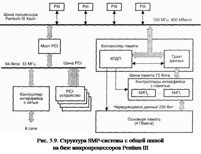 Если все процессоры имеют равный доступ ко всем модулям памяти и всем устройствам ввода-вывода и каждый процессор взаимозаменяем с другими процессорами, то такая система называется SMP-системой. В системах с общей памятью все процессоры имеют равные возможности по доступу к единому адресному пространству. Единая память может быть построена как одноблочная или по модульному принципу, но обычно практикуется второй вариант.