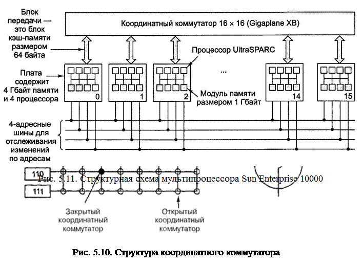 Использование только одной шины ограничивает размер мультипроцессора UMA до 16 или 32 процессоров. Чтобы получить больший размер, требуется другой тип коммуникационной сети. Самая простая схема соединения – координатный коммутатор (рис. 5.10). Координатные коммутаторы используются на протяжении многих десятилетий для соединения группы входящих линий с рядом выходящих линий произвольным образом.