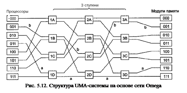 На основе коммутаторов 2x2 можно построить многоступенчатые сети. Один из возможных вариантов – сеть omega (рис. 5.12). Для n процессоров и n модулей памяти тредуется log2n ступеней, n/2 коммутаторов на каждую ступень, то есть всего (n/2)log2n коммутаторов на каждую ступень. Это намного лучше, чем n2 узлов (точек пересечения), особенно для больших n.