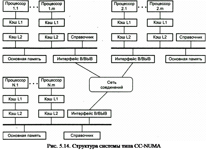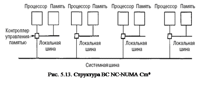 Если время доступа к удаленной памяти не скрыто (т.к. кэш-память отсутствует), то такая система называется NC-NUMA (No Caching NUMA – NUMA без кэширования) (рис. 5.13).