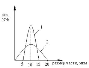 Кривая 1 – кривая с узким распределением частиц, кривая 2 – с широким.