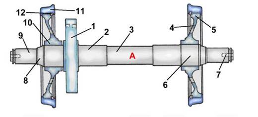 1-зубчатое колесо; 2-шейка оси под моторно-осевой подшипник; 3-средняя часть оси; 4-диск колесного центра; 5-обод колесного центра; 6-подступичная часть оси; 7-центровое отверстие; 8-предподступичная часть оси; 9-шейка оси под буксовый подшипник; 10-ступица колесного центра; 11-бандаж; 12-бандажное кольцо.