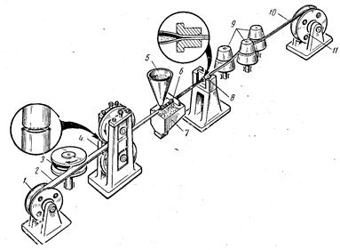 Лента 2 мягкой малоуглеродистой стали 08кп холодного проката сматывается с кассеты 1, очищается щетками 8, сворачивается вальцами 4 в желоб (заготовку) и заполняется из бункера 5 тонко размолотым порошком. Избыток порошка снимается дозатором 6 и ссыпается в бункер 7. Заготовка с порошком протягивается пиками 9 через калибровочную доску 8 со втулкой (фильером), изготовленной из твердого сплава, сворачиваясь при этом в трубку. Готовая проволока 10 наматывается на барабан 11. Порошковая проволока значительно дешевле легированной и производство её несложно.