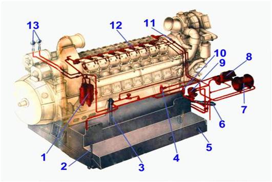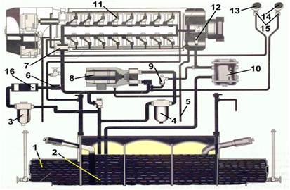 1)фильтры тонкой очистки топлива; 2)топливомерное стекло; 3)горловина под мерную линейку; 4)предохранительный клапан; 5)топливный бак; 6)заправочная горловина; 7)топливоподогреватель; 8)топливоподкачивающий насос; 9)фильтр грубой очистки топлива; 10)невозвратный клапан; 11)перепускной клапан; 12)топливные насосы высо кого давления; 13)манометры.