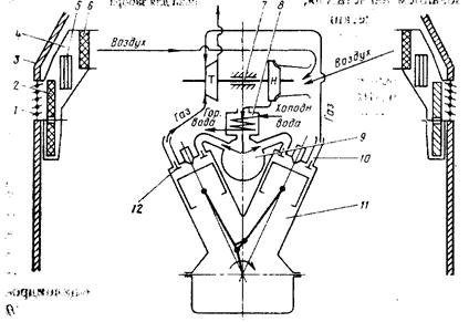 Нагнетатель турбокомпрессора приводится во вращение от газовой турбины Т. Нагнетатель и газовая турбина смонтированы в одном корпусе и представляют единый агрегат турбо-компрессор. Отработавшие газы из цилиндров дизеля через открытые в период выпуска клапаны 12 поступают в выпускные патрубки 10, расположенные с наружной стороны дизеля, и далее в газовую турбину, где энергия газов используется для приведения во вращение ротора турбокомпрессора. Из турбины отработавшие газы по выпускному патрубку направляются в глушитель и далее в атмосферу.