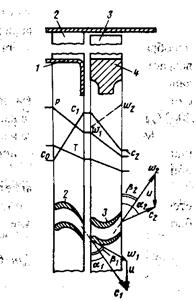 Рис. 3. Схема проточной части и треугольники скоростей реактивной турбины: