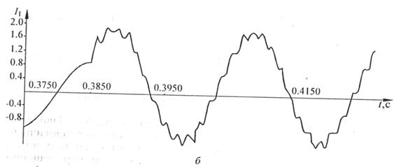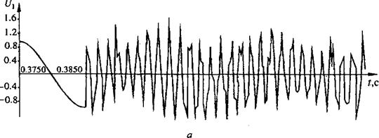 и нулю для частот ниже промышленной и апериодической составляющих; предшествующий режим - режим натуральной мощности, особая фаза -А. Изменение напряжения и тока в начале линии при трехфазном КЗ в точке 120 км показано на рисунка 7.1. Кривые напряжений и токов свидетельствуют о наличии в их составе высших гармонических составляющих.