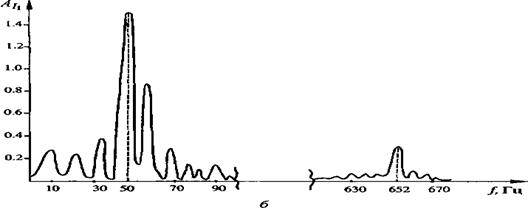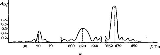 Частотный анализ этих кривых по методу, описанному в лекции 6, позволил получить амплитудно-частотные характеристики, определяющие параметры свободных составляющих напряжения (см. рисунок 7.2). Результаты расчета переходных процессов и их спектров позволили построить зависимости частот свободных составляющих от расстояния до точки КЗ.