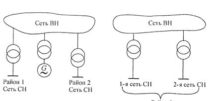 Оптимизация структуры сети являются эффективным средством ограничения токов КЗ. С этой целью применяется периферийное (продольное) разделение сетей, при котором части территории сетей (районы) одного напряжения связываются между собой только через сеть повышенного напряжения (см. рисунок 8.1, а). Местное, или поперечное, разделение сетей (см. рисунок 8.1, б) осуществляется наложением сетей одного и того же напряжения на площади какого-либо района и связью этих сетей через сеть повышенного напряжения.