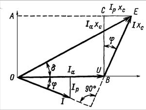 На рисунке 10.3 показана векторная диаграмма нормального режима работы электропередачи, из которой ввиду равенства отрезков ОА = E sinδ и ВС = Iа Хс вытекает соотношение