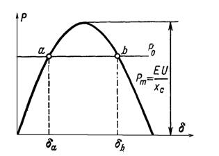 который называется идеальным пределом мощности рассматриваемой простейшей электрической системы. Равновесие между мощностью турбины и генератора достигается лишь при значениях мощности меньших Рm, причем данному значению мощности турбины Ро соответствуют две возможные точки равновесия на характеристике мощности генератора и, следовательно, два значения угла δа и δb (см. рисунок 10.4). Однако в действительности устойчивый установившийся режим работы электропередачи возможен только при угле δа. Режим в точке b на падающей части характеристики неустойчив и длительно существовать не может.