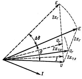 на два отрезка: IХтл и IХг – в отношении значений индуктивных сопротивлений Хтл и Хг. При увеличении угла δ на Δδ вектор ЭДС генератора