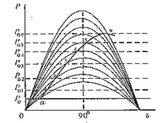 Рассматривая установившиеся режимы работы генератора с АРВ при различных значения угла δ, исходят из постоянства напряжения Uг. Значение же ЭДС генератора при этом будет возрастать с увеличением угла δ. На рисунке 11.3 показано семейство характеристик Р = f (δ), построенных для различных значений ЭДС.