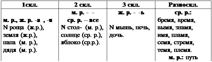 | 1скл. | 2скл. | 3скл. | Разноскл. | На -ия, -ий, -ие. | |