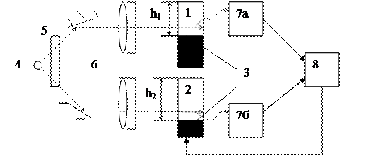 1 и 2 – кюветы, 3 – экранирующие диафрагмы, 4 – источник света, 5 – спектральный светофильтр, 6 – оптическая система, 7 – фотоприемники, 8 – электроника.