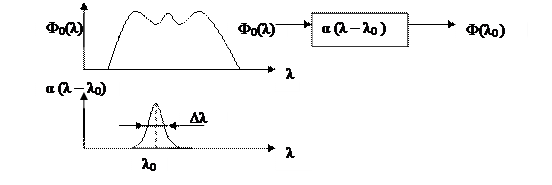 φ(λ) - спектр излучения; α(λ – λ0) - функция пропускания; λ0 - рабочая длина волны; ∆λ - полуширина спектра пропускания.