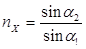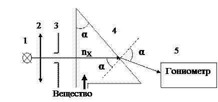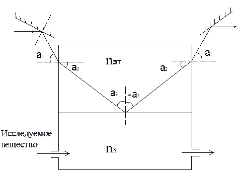 Искомый показатель преломления nX может быть определен исходя из угла преломления α2, который измеряется гониометром, и угла α1, определяемого геометрическими параметрами кюветы.