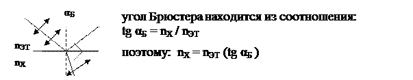 2. Метод, основанный на регистрации угла Брюстера. Плоскость поляризации отраженного под углом Брюстера луча перпендикулярна плоскости падения (ТЕ-поляризация). Физически явление связано с особенностями пространственной ориентации диполей сред и рассматривается в курсе общей физики. Данный метод относится к комбинированным: в состав прибора входят поляризационные элементы.