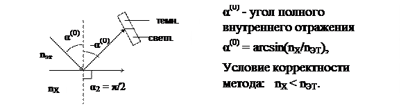 3. Метод, основанный на регистрации угла полного внутреннего отражения. Измерения проводятся по контрасту освещения экрана отраженным лучом. Схема измерения показана на рис.