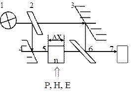 1 – источник излучения, 2 и 6 – полупрозрачные пластины; 3 и 4 – зеркала, 5 – образец, 7 – фотоприемник.