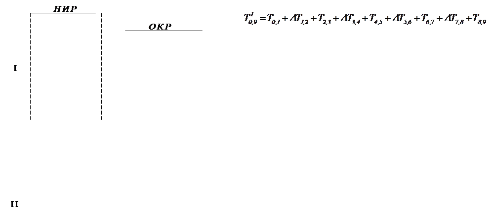 Условные обозначения: t – текущее время; НИР – научно-исследовательские работы; ОКР – опытно-конструкторские работы; ТПП – технологическая подготовка производства; ОП – изготовление опытного образца; СП – серийное производство (изготовление установочной партии); ΔTij – время запаздывания (+) или опережения (-) начала следующей j- ой стадии относительно окончания предыдущей i -ой стадии; Тi – длительность цикла i -ой стадии инновации; Т0, 9 – совокупная длительность цикла инновации, I – последовательное осуществление стадий цикла; II – частично параллельное осуществление стадий цикла.